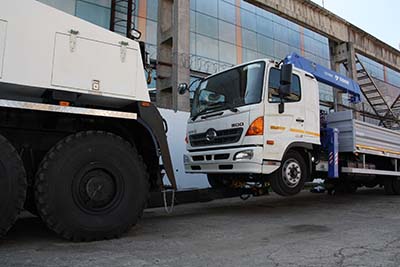 Основной элемент конструкции эвакуатора - стрела, при помощи которой осуществляется подъем оси эвакуируемого автомобиля и транспортировка методом частичной погрузки. Ходовые испытания основной стрелы эвакуатора включали в себя испытания тяжёлым грузовиком Hino-500 c КМУ и полуприцепом. Разумеется, прошли успешно.