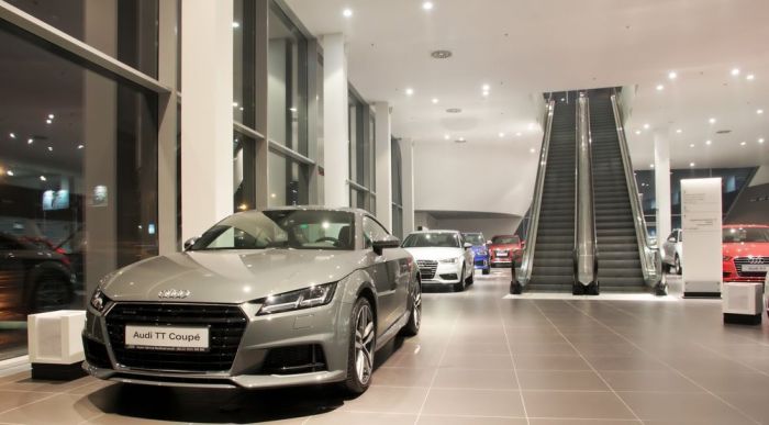 КА: Уникальность дилерского центра начинается с его архитектуры. Центр построен по концепции «Терминал». Наклонные стены, в виде асфальтовой дороги с разметкой из ярких ламп. Лифты и эскалаторы. Шоу-румы на 1 и 3 этажах. Посетитель может себя почувствовать одновременно и в терминале современного аэропорта, и на спортивном автомобильном треке. Автомобили "Ауди" – спортивные автомобили. И эта спортивность ощущается во всем. И в фасаде, отделанном алюминиевыми сотами, предающими лёгкость, воздушность, напоминающими об уникальной технологии Audi, кузова автомобилей которой создаются из алюминия.