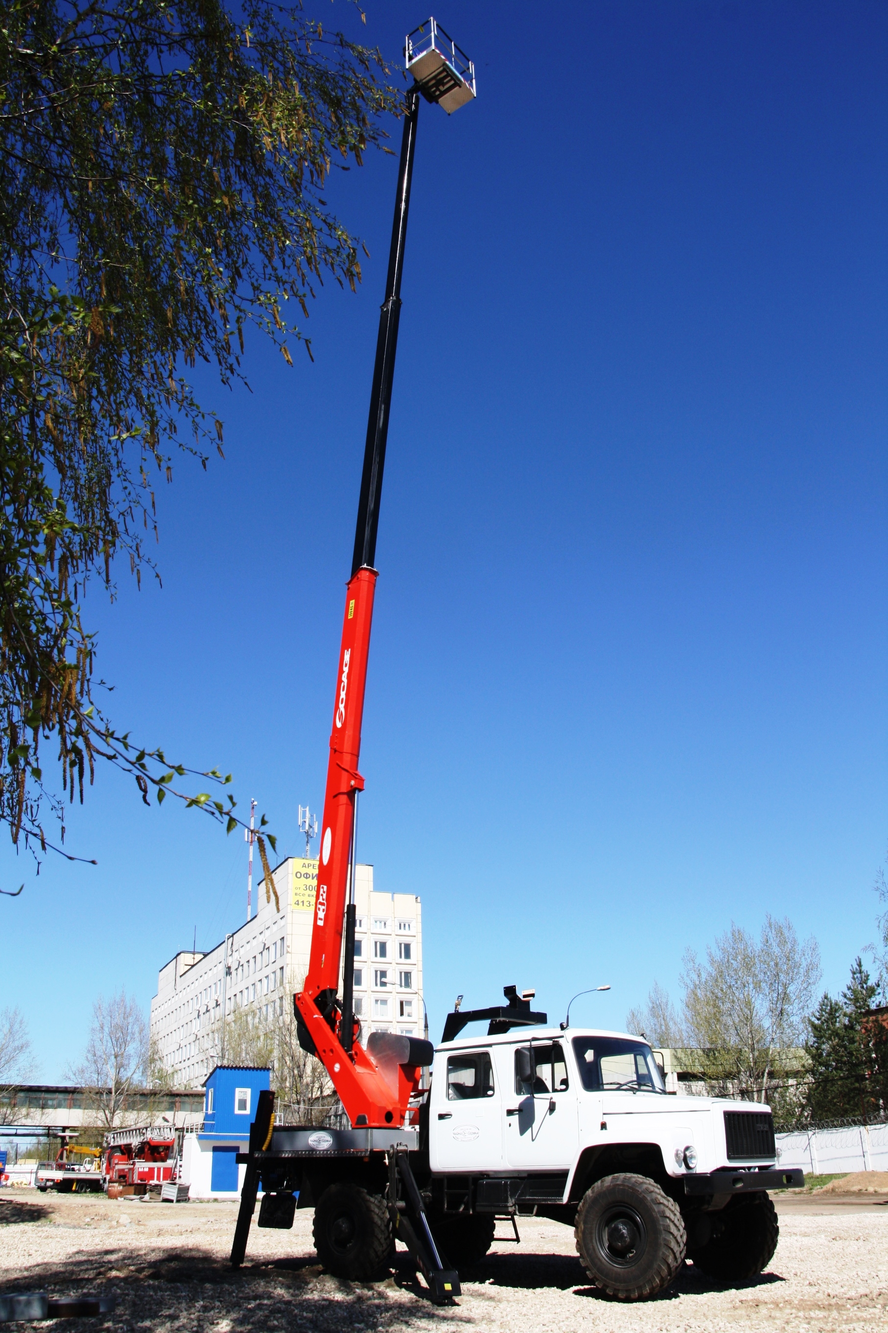 Характеристики АГП Чайка-Socage T322: высота подъема – 22 метра; максимальный вылет – 15,5 метров; грузоподъемность люльки – 300 кг; угол поворота – 360 градусов.