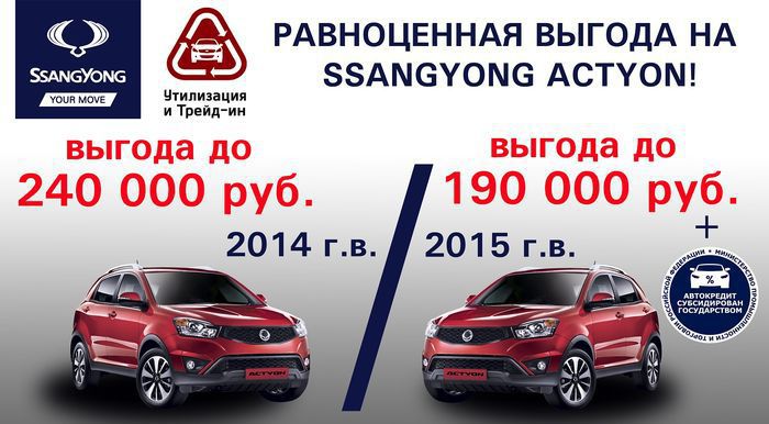 *максимальная выгода 240 000 руб. предоставляется на автомобиль SsangYong Actyon 2014 года производства по сравнению с максимальной ценой перепродажи SsangYong Actyon 2015 года производства, с учетом специального предложения и участия в программе утилизации и trade-in. В государственной программе субсидирования принимают участие автомобили 2015 года производства стоимостью до 1 000 000 руб. Подробности у сотрудников автоцентра «Пандора».