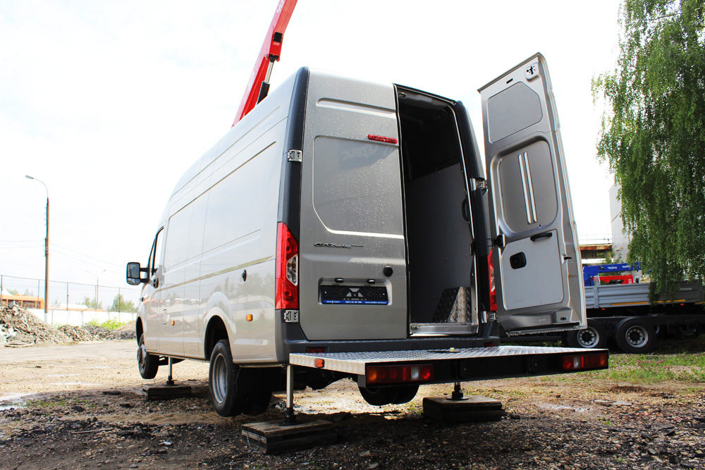 Компактный телескопический автогидроподъемник устанавливается внутри фургона на раму шасси ГАЗель NEXT. Фургон может быть использован под перевозку необходимого инструмента для проведения высотных работ.